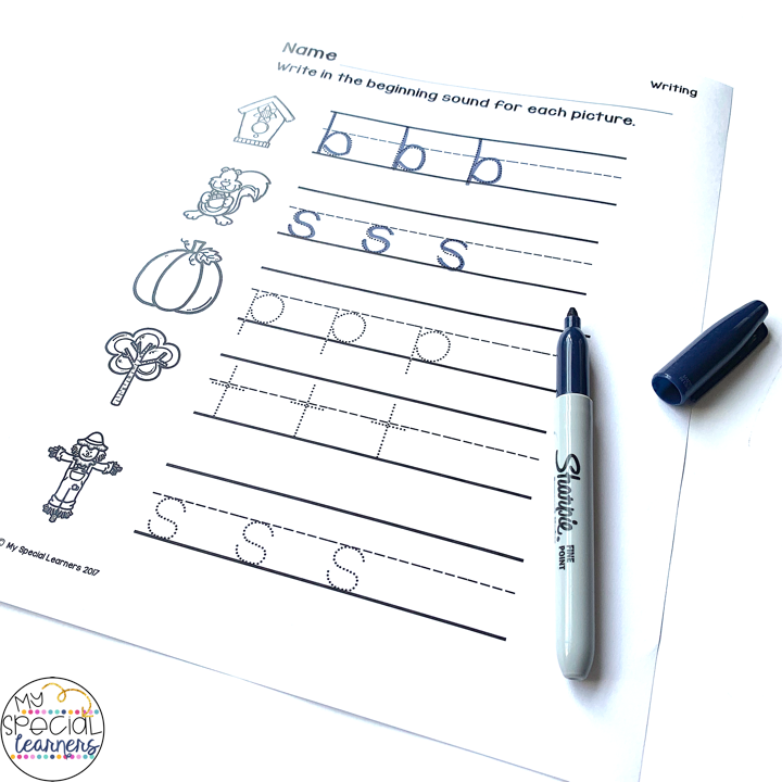 In the set of worksheets there are some writing worksheets for writing the beginning letter sound, along with writing the full word that goes with each photo. Great for beginning sounds, letter formation, and writing goals!