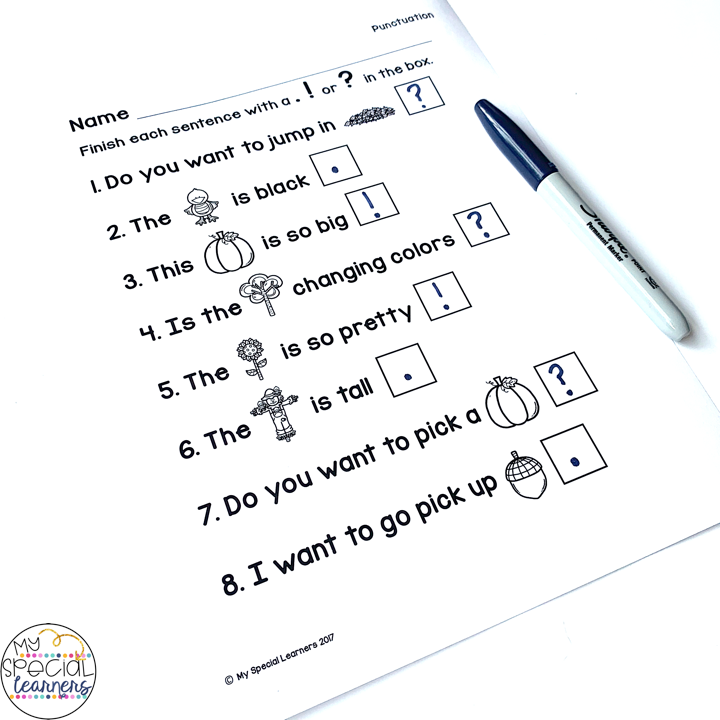 When I created this set of autumn themed ELA worksheets, I wanted to be sure to add in a variety of elementary language arts skills and differentiate some of the skills so that writers & non-writers could complete the worksheets. These are great for homework, one on one work, adapted work to take into inclusion, or even morning work. But my favorite part? There is NO prep and NO color ink necessary! As special educators, we have enough prep to do, so I wanted to make this easy to print and use!