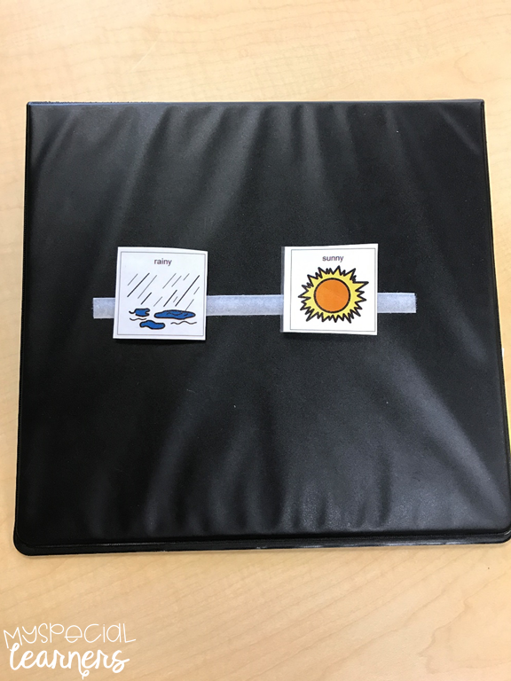 I whipped up a binder with days of the week, dates, and weather to help my students answer questions during our morning group. We use Starfall calendar and check the weather on Accuweather each group time. For my students who needed assistance participating, they were either given 2 or 3 choices, depending on their ability.