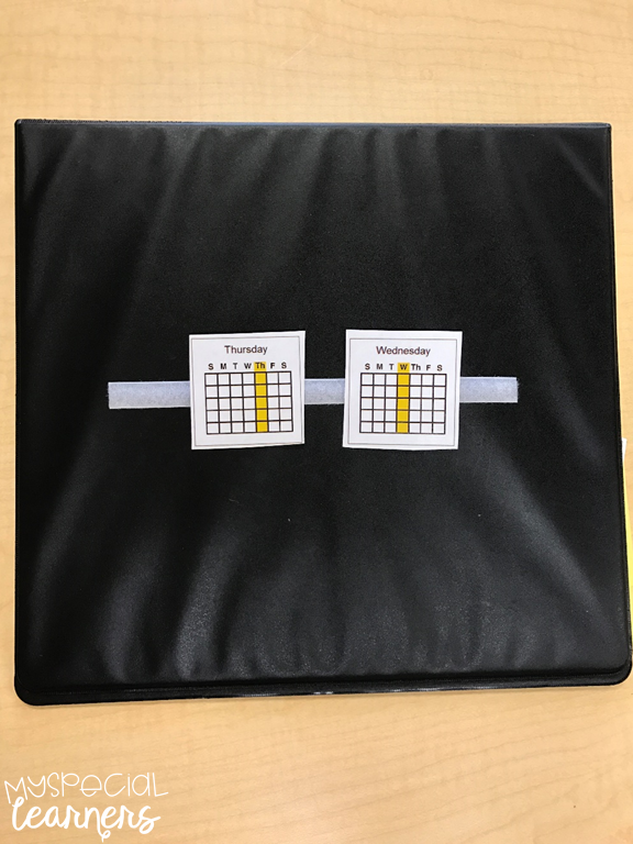 On the inside, I had plastic file folders where I stored the pieces like this. It wasn’t cute, but it was very functional! I would just place the binder with answer choices in front of the student that I wanted to tell me the day of the week, date, or weather that day! SO easy!