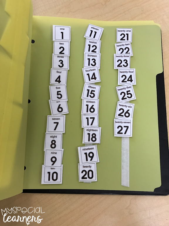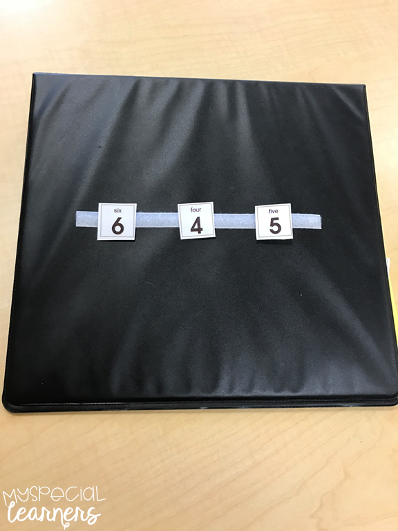 For students that were working on choosing from an array of 3, I would pull out the pieces from the inside of the binder and put them on the Velcro strip on the front just like this. They would either point to the number or give me the number, depending on the student.
