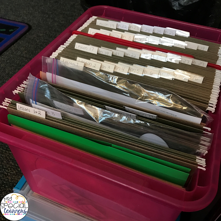 I started by emptying out this tub (ignore the tabs, those are all wrong and I still need to update them!). Inside the tub I put all of the printed materials in order from beginning of the month until the end of the month. Once I get around to changing the tabs, they are going to have the days of the week on them to go along with my monthly plans calendar! I assigned 1-2 activities to each day of the month and do most of them in whole group format this year.