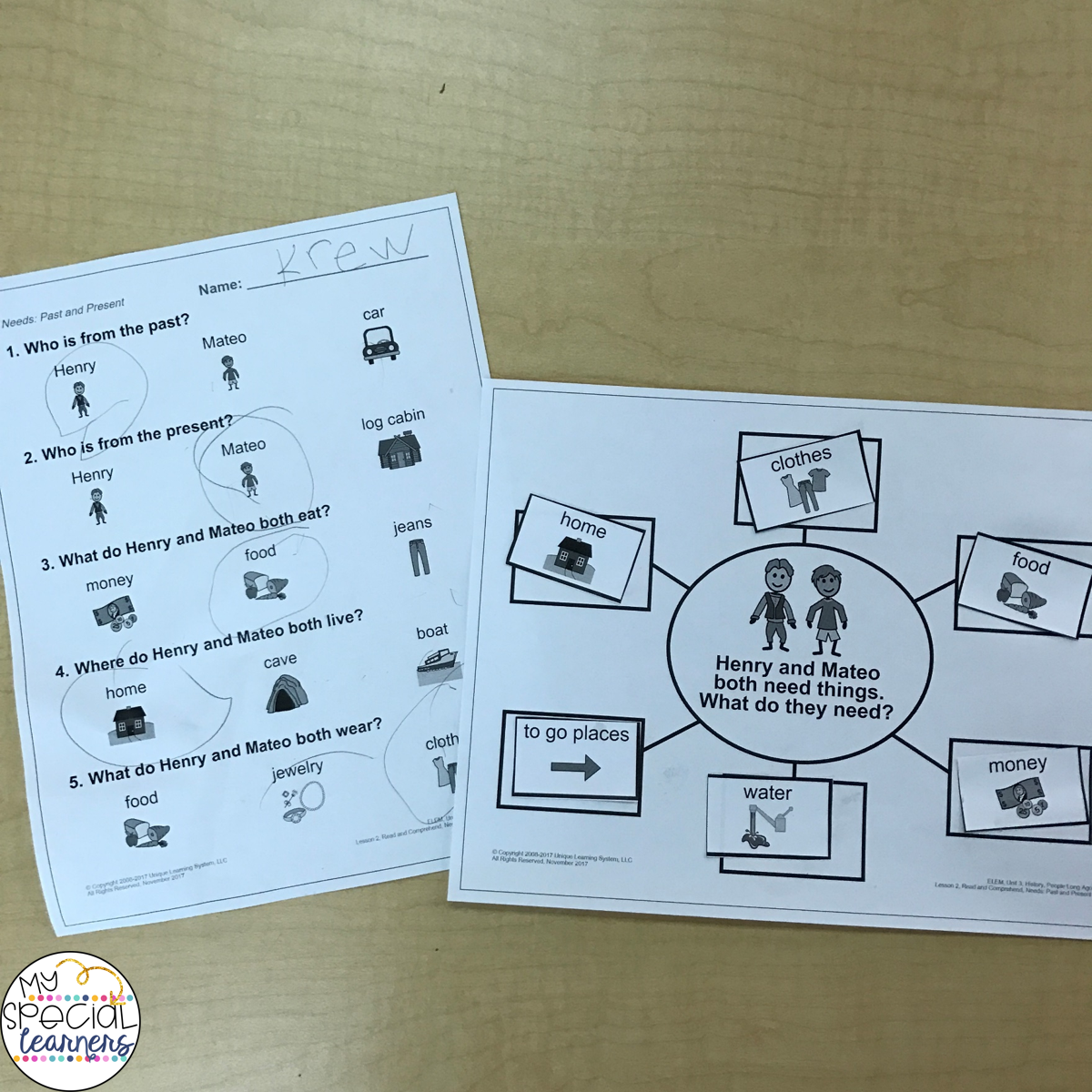 The other comprehension lessons (lesson 1 & 2) are always another “must do” with my students. I love that they differentiate the comprehension questions page (3 levels: 1 with just words, 1 that you see above with pictures, and another that has pictures but only 1 question per page). It provides easy differentiation when you need it! We also did the additional materials that went along with this lesson which was awesome because there were no wrong answers for the “needs” web!