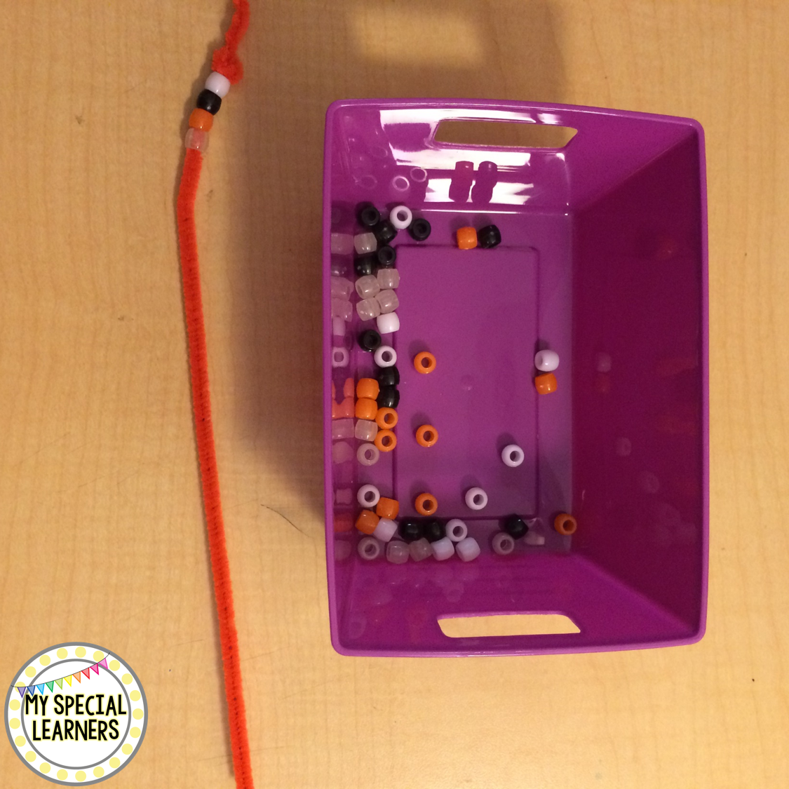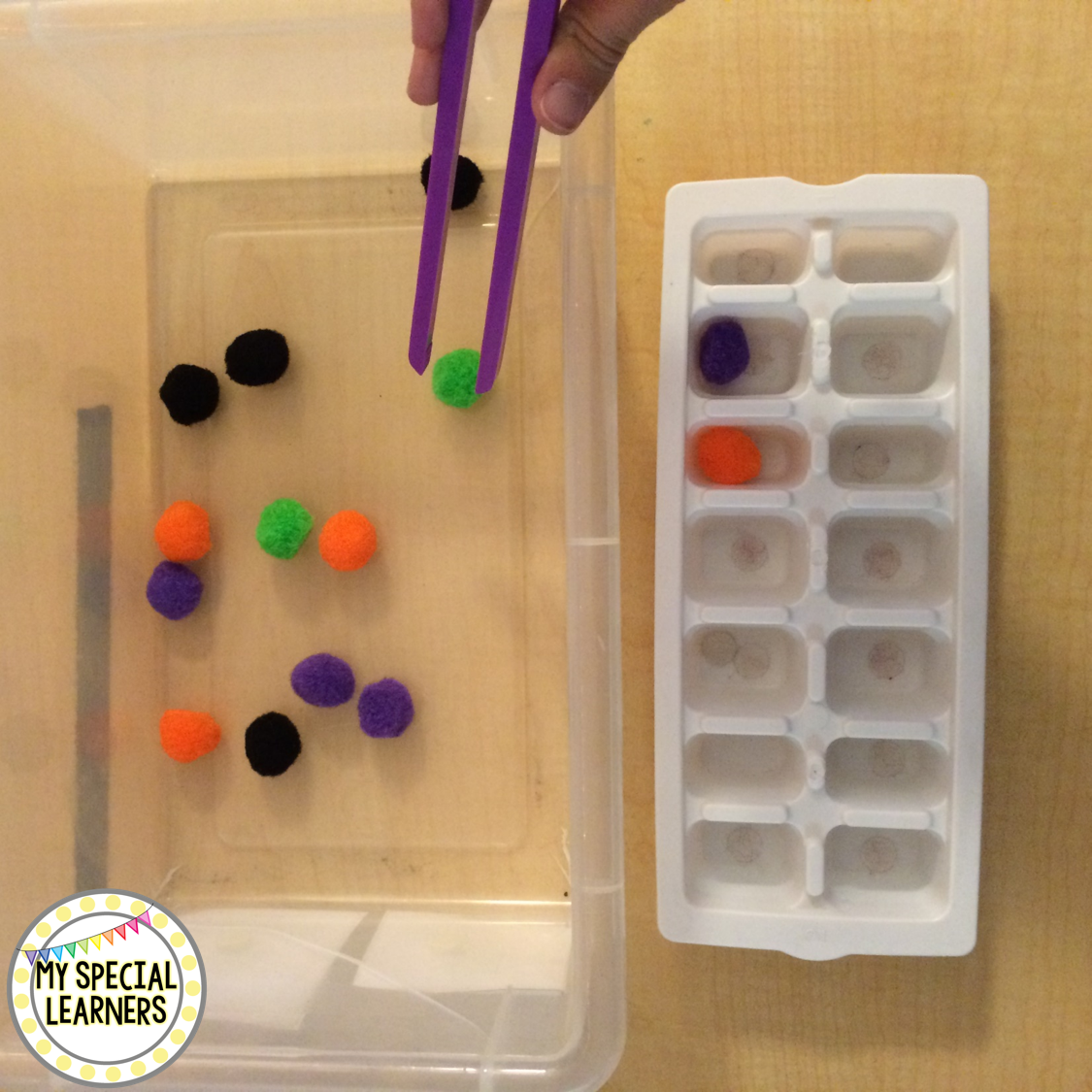 Easy to put together, all you need are some Halloween colored pom pom balls, an ice cube tray, and big tweezers! Great for fine motor work. š You could even have higher leveled students do AB or ABB patterns in the tray!