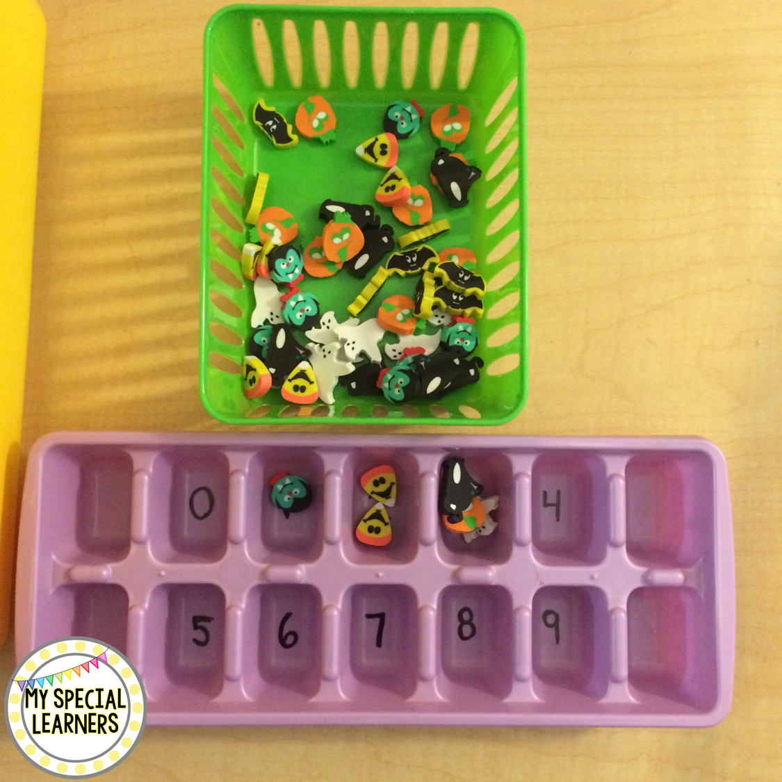 Adorable activity for counting and creating sets! Grab an ice cube tray and write number in sharpie! Plastic tray from Dollar Tree and the cute erasers are of course from Target Dollar Spot! This is my favorite task for October. š