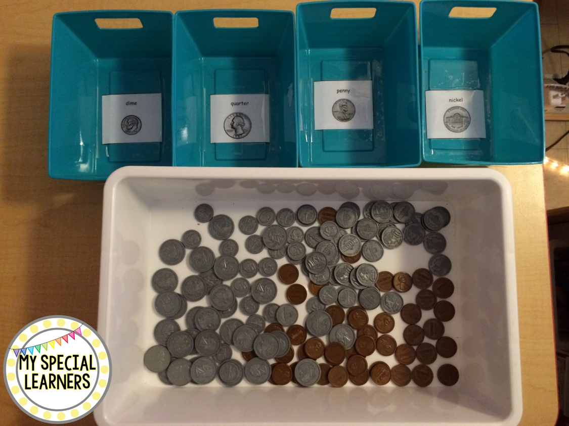 This task has been WONDERFUL for my fast workers who are also working on coin identification. Ideally, I’d rather use REAL coins for this sort, but the Lakeshore ones are doing the job for now. Tiny bins found at Dollar Tree. šŸ™‚